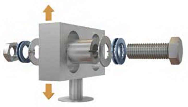 图2:测试图,各安装部件垂直震动,连接点受力于每个冲程的两次冲击,各次冲击方向都是与螺栓平行的,箭头显示测试的时候的震动方向。测试后,螺栓要作旋转检测。