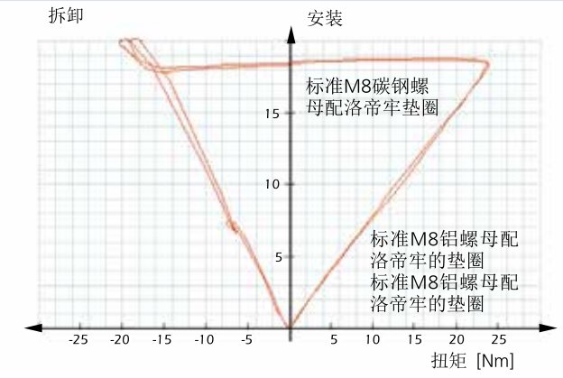 图1:震动测试仪显示洛帝牢防松垫圈有很好的螺栓锁紧功能。仅仅有限的一点载荷损失,这是由于初安装的原因产生的。当你松开这个连接的时候,这种对齿面的锁紧方式在松开的时候载荷明显升高,以此说明它有很好的锁紧效果,而其他的锁紧方式在测试的时候不能有效地阻止螺丝松动。