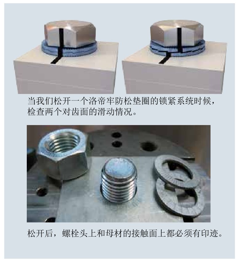 拧紧洛帝牢防松垫圈的时候,请使用标准的工 具,数据参考9-11页。如果你需要其他级别螺栓的安装数据,请联系洛帝牢的相关代表。